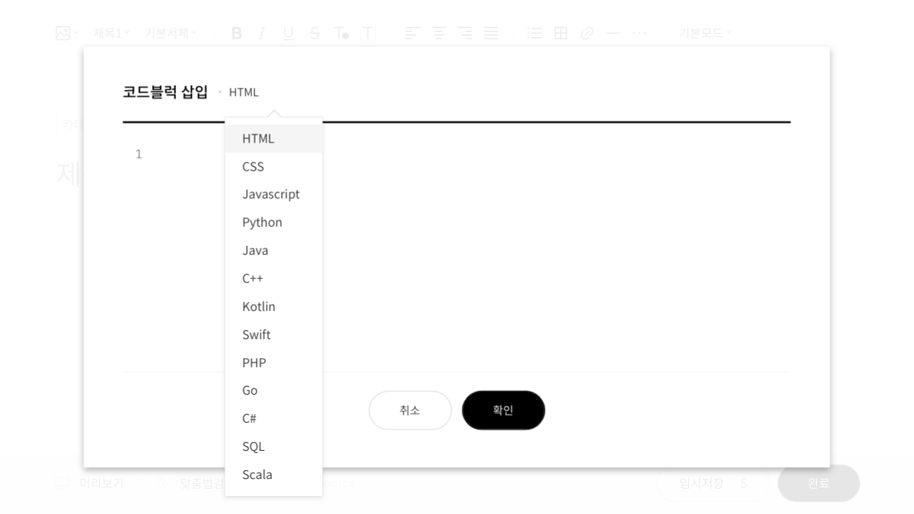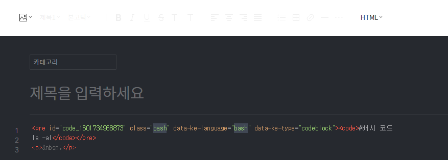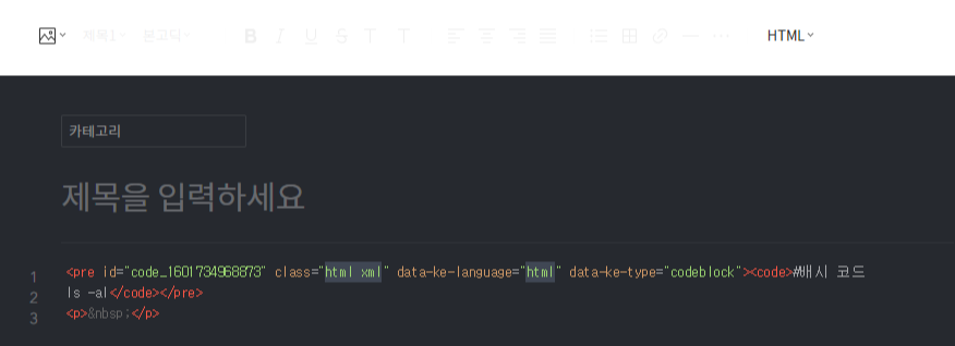 코드블럭을 일단 작성하고 HTML 편집 모드로 들어갑니다.